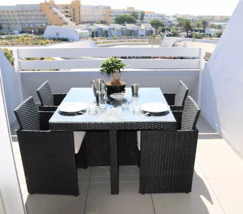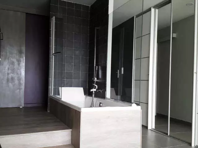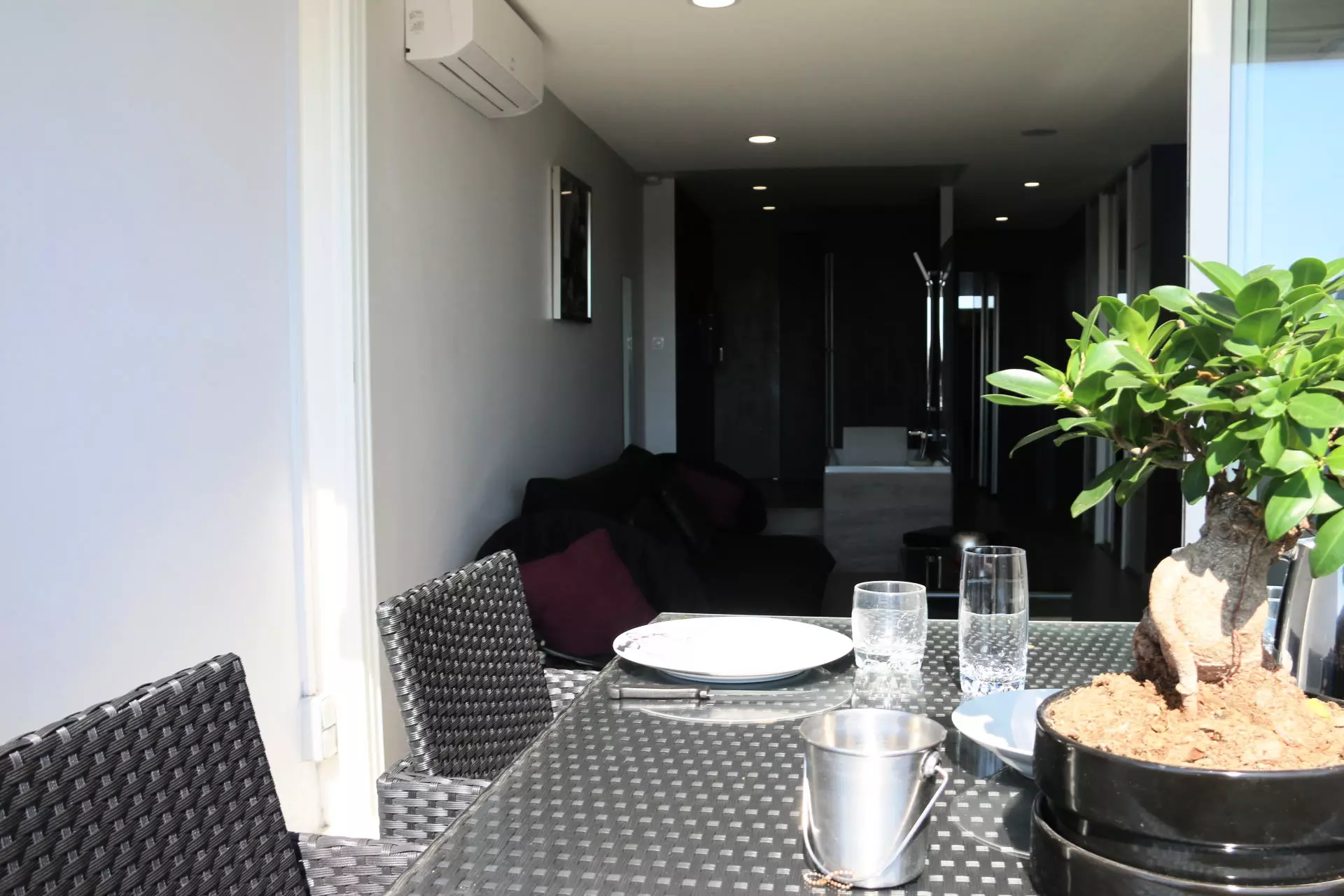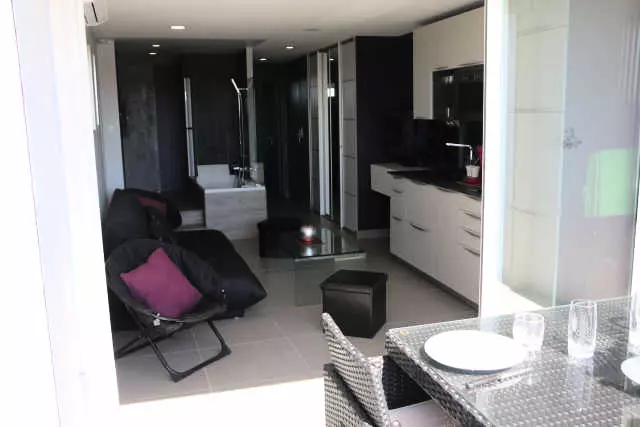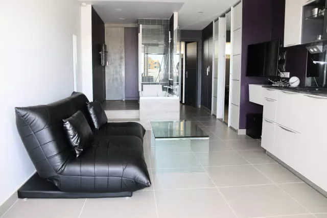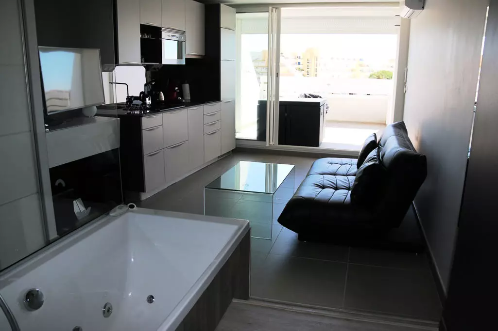 Klimatisiertes Apartment für 2 Personen in der Résidence Port Ambonne. Zum Wohnraum offenes Badezimmer mit Whirlpool-Badewanne. Ausgestatteter Küchenbereich (Geschirrspüler, Waschmaschine, Mikrowelle, Backofen, Kaffeemaschine usw.)