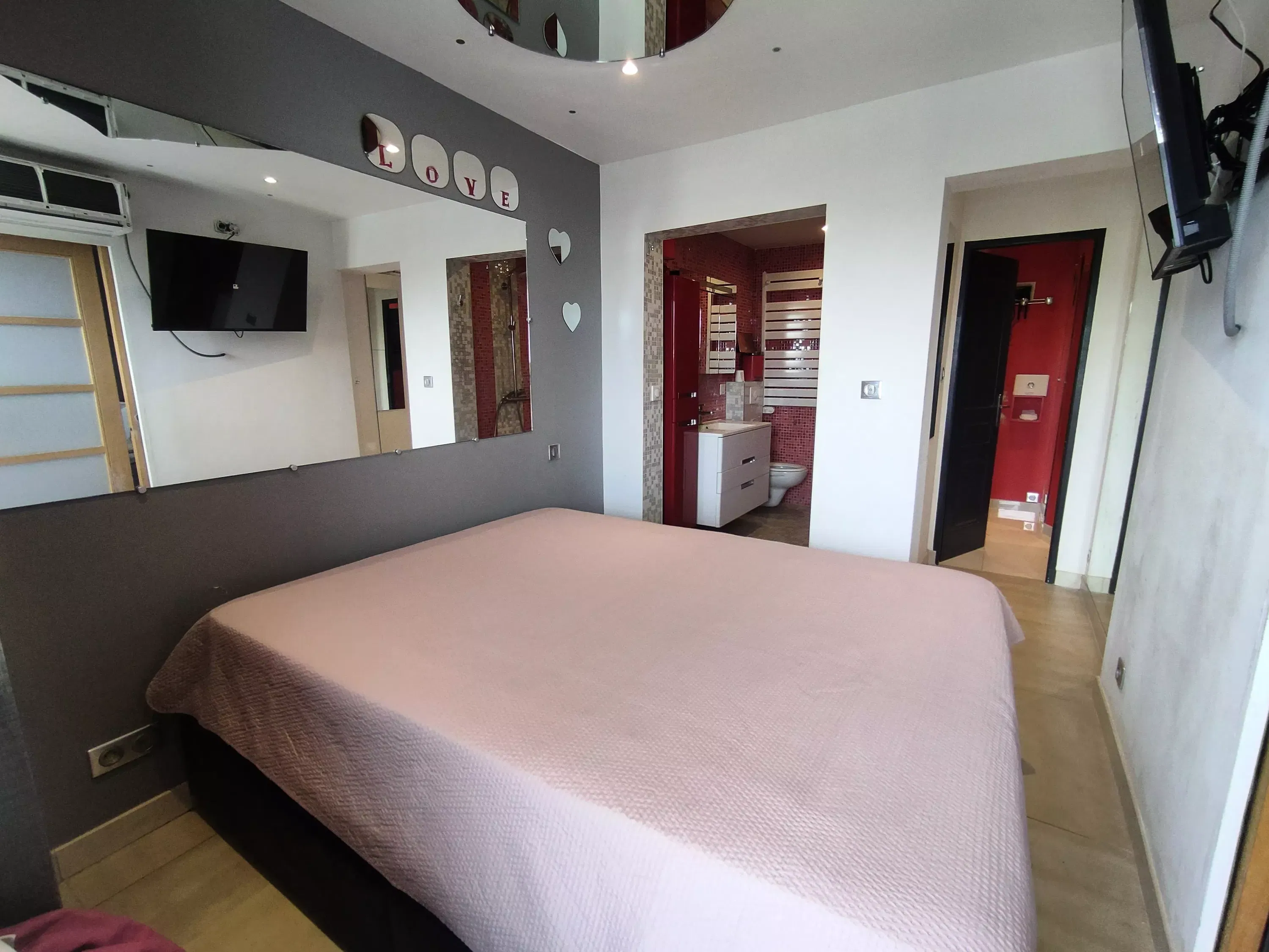 Klimatisiertes Apartment für 2 bis 4 Personen, gelegen im Héliopolis Eingang O ohne Aufzug, im Erdgeschoss, Meerblick. Zwei Schlafzimmer mit jeweils einem 160 cm breiten Bett und einem Fernseher, an jedes Schlafzimmer angrenzendes Badezimmer, eines davon mit Zugang zum Wohnzimmer. Küche ausgestattet mit Mikrowelle, Backofen, Geschirrspüler, Waschmaschine und Kaffeemaschine. Eine separate Toilette. Terrasse mit Markise. Parkplatz Nr.