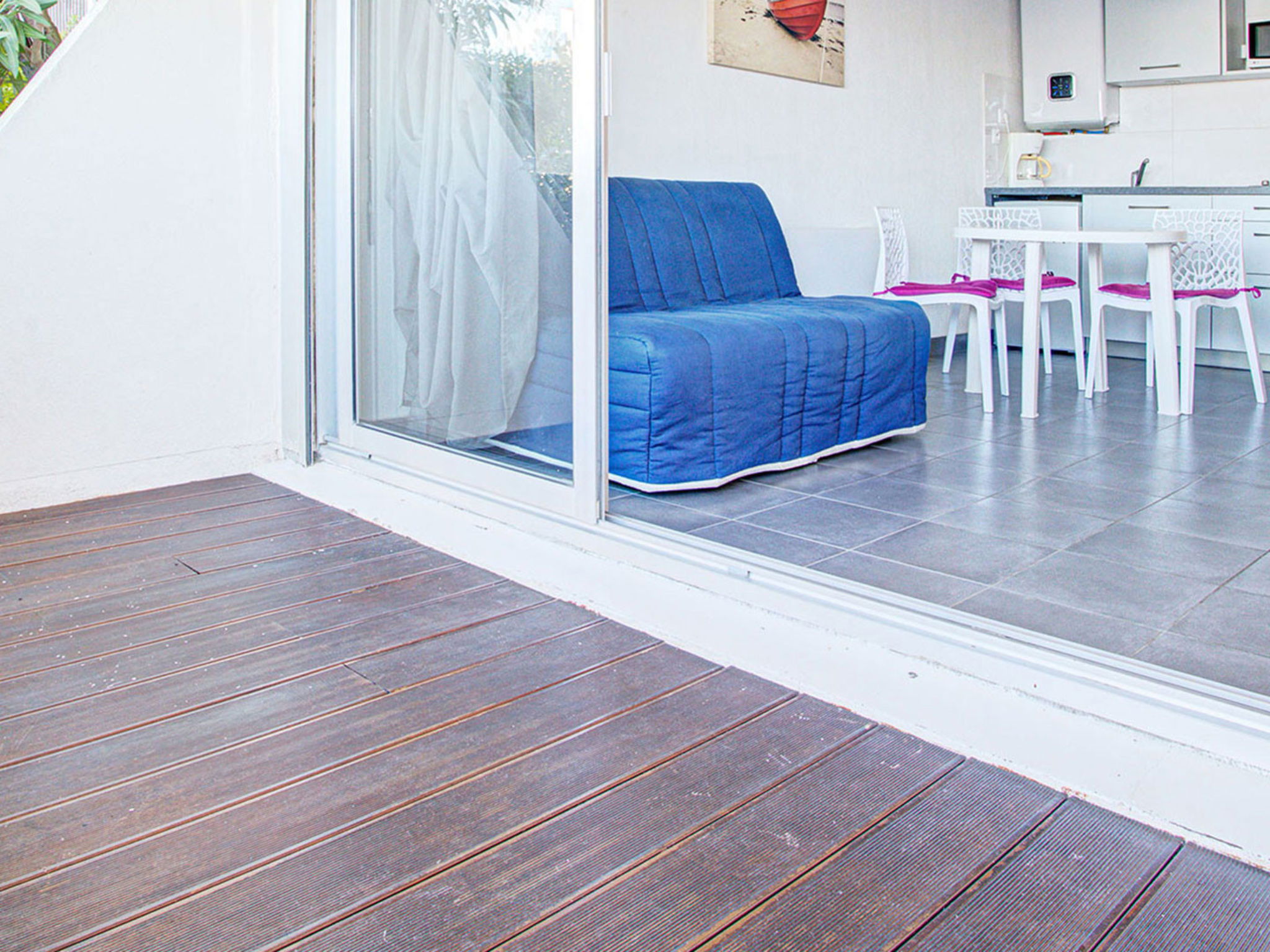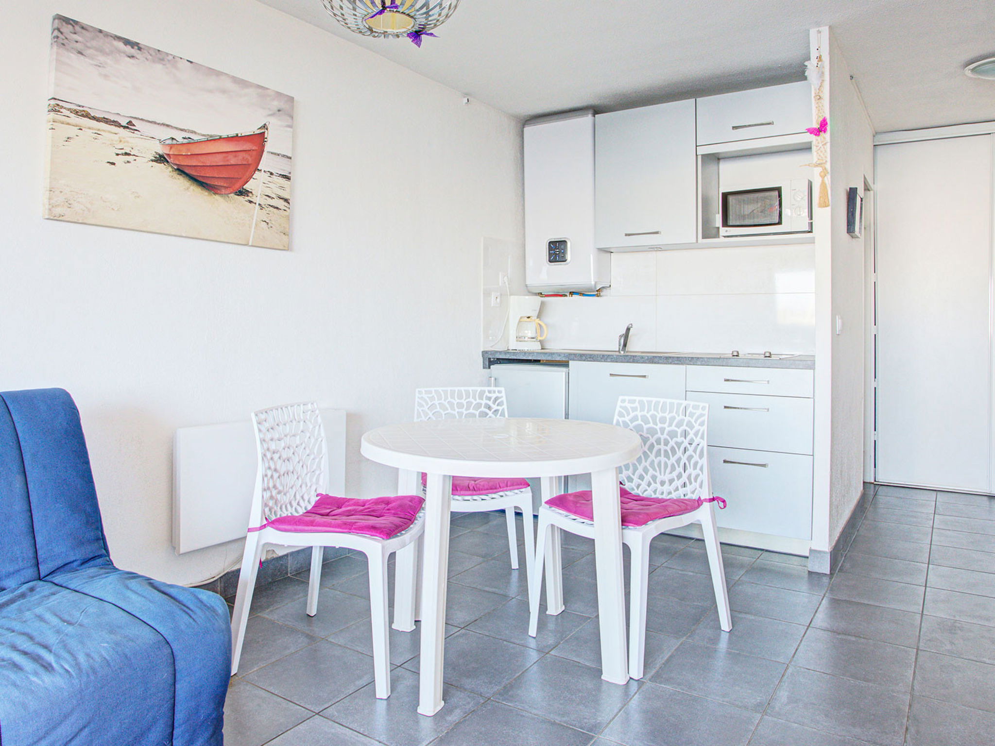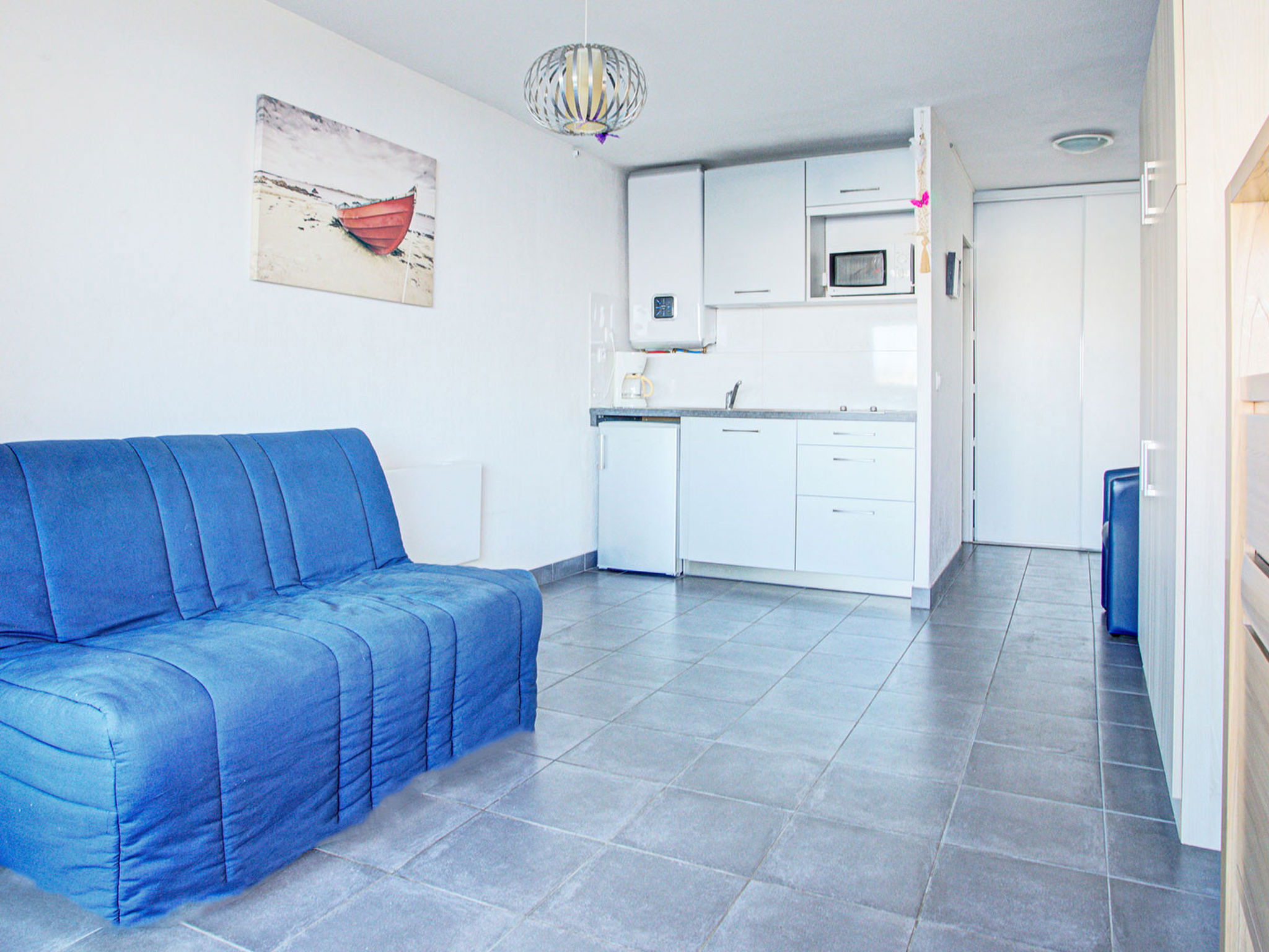 "La Croisette", 1-Zimmer-Studio 20 m2, im Erdgeschoss. Objekt geeignet für 3 Erwachsene. Wohnzimmer mit 2 Diwanbetten, 2 Ausziehbetten und TV. Küche (2 Kochplatten, Mikrowelle, elektrische Kaffeemaschine). Dusche/WC. Balkon. Sicht auf den Hafen. Bitte beachten: Nichtraucher-Unterkunft. Rauchmelder. Inserat eines gewerblichen Vermieters nach Artikel 155, IV, CGI