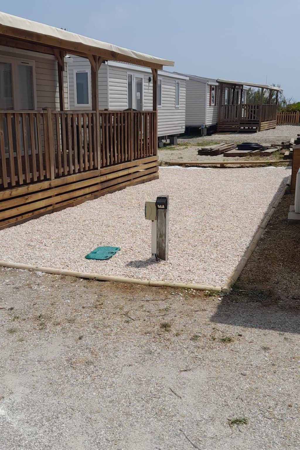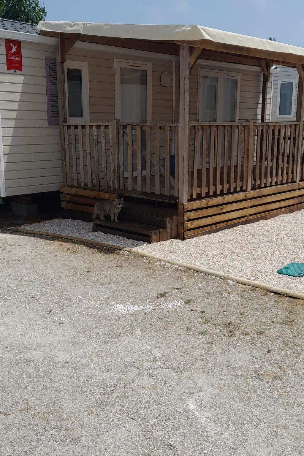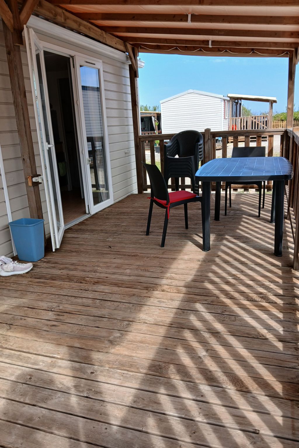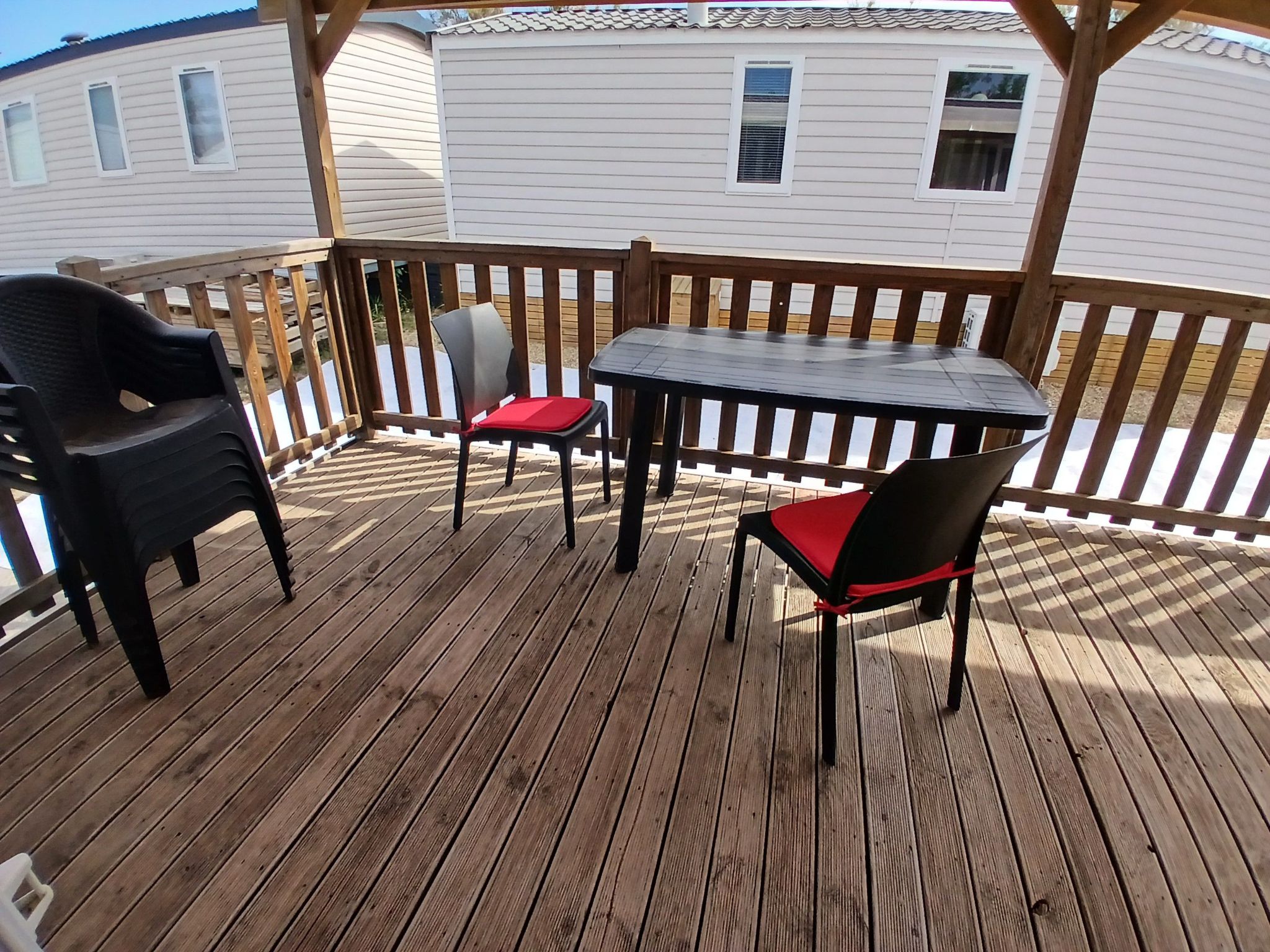 Genießen Sie entspannende Momente im Freien auf der Terrasse oder im Gemeinschaftsgarten, während Sie die Kühle der Klimaanlage genießen, die in einigen Bereichen des Mobilheims verfügbar ist.
